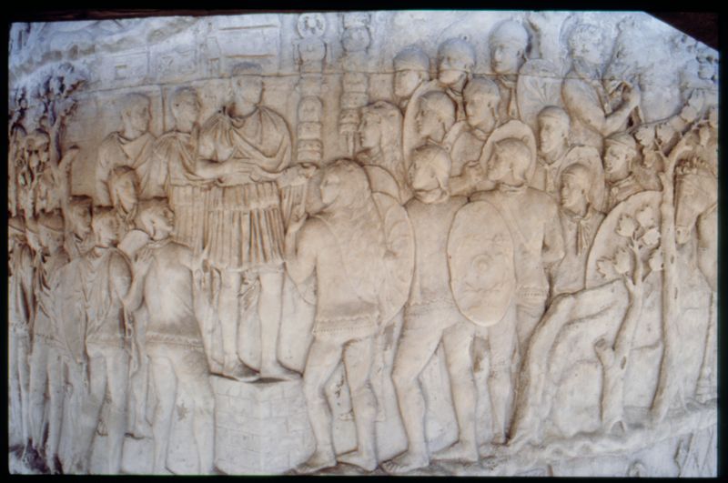 In this scene, as in so many on which the emperor is shown, Trajan occupies the very centre of the scene and most of its height, so though he is not larger than most other figures, he is given more prominence.
