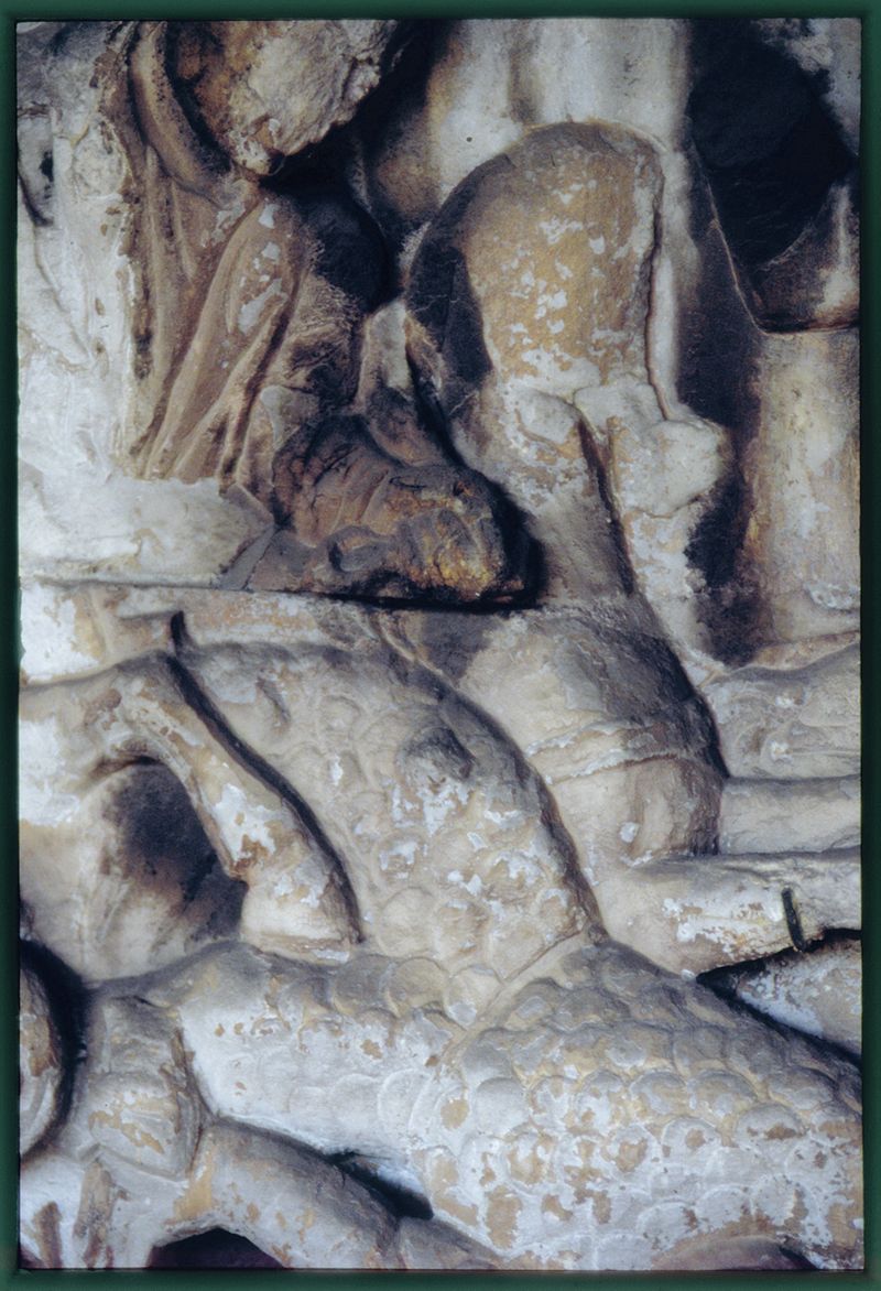 A clear block line runs across the middle of this image and as elsewhere key features of the design are not carved across it.